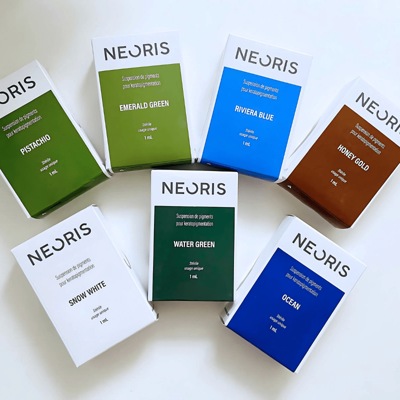 Contrairement aux encres ou pigments à usage médical général, les pigments Neoris® ont été spécifiquement conçus pour la kératopigmentation esthétique. Fabriqués en Suisse selon des normes pharmaceutiques strictes, ils sont stériles, non toxiques, et 100 % compatibles avec la cornée.